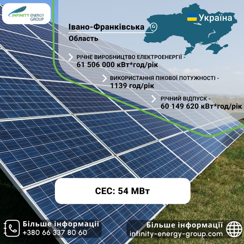 Цей проєкт передбачає будівництво та експлуатацію сонячної електростанції (СЕС) на фотовольтаїчних (сонячних панелях) в Івано-Франківській області загальною потужністю 54 МВт. З можливістю введення в експлуатацію у 2025 p. На цей час ділянка частково документально готова для будівництва: договір оренди земельної ділянки (земельна ділянка з відповідним цільовим призначенням: для розміщення, будівництва, експлуатації та обслуговування будівель і споруд об’єктів електрогенеруючих підприємств, установ і організацій), містобудівні умови та обмеження для проєктування об’єкту будівництва, містобудівний розрахунок з теніко-економічними показниками, Робочий проєкт будівництва сонячної електростанції, договір про нестандартне приєднання до електричних мереж з обленерго та технічні умови на приєднання до загальної мережі, розрахунок нестандартного приєднання, експертний звіт щодо розгляду проєктної документації за робочим проєктом, Дозвіл на виконання будівельних робіт.